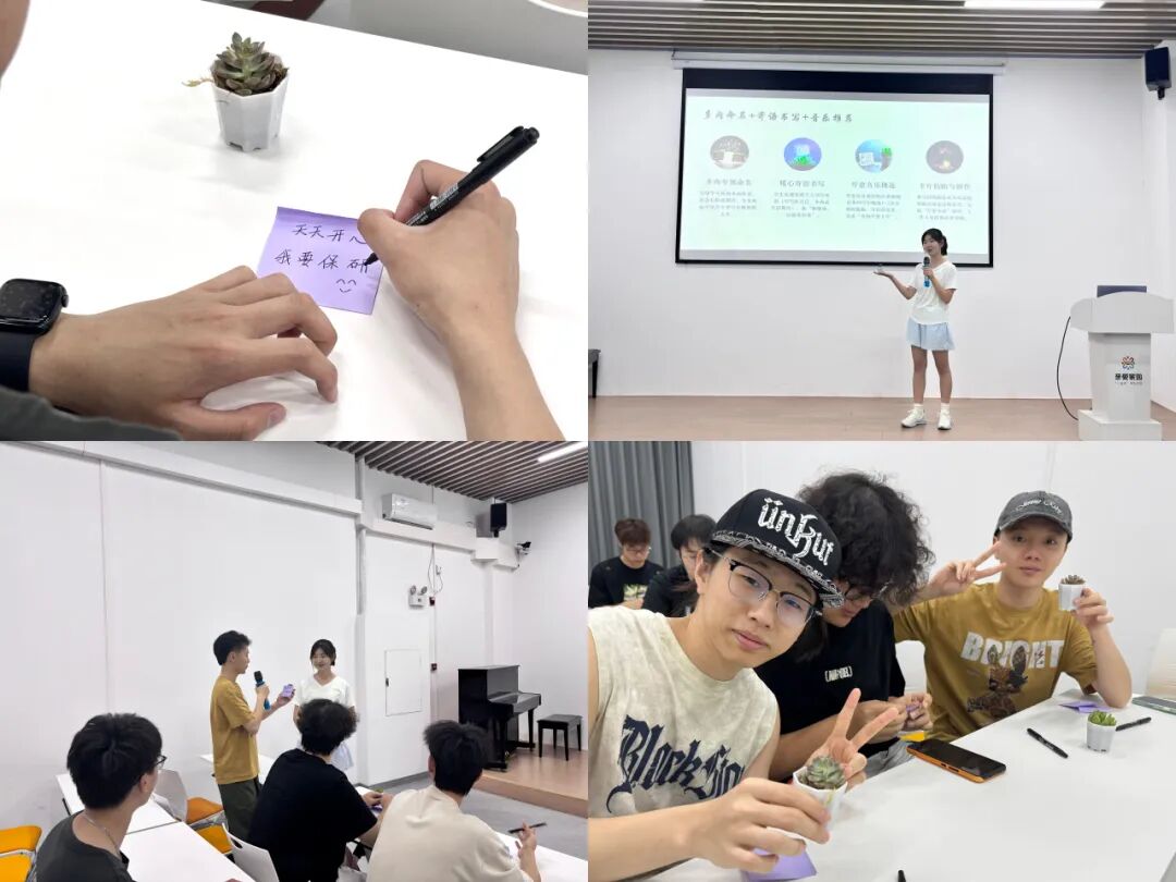 在身心舒缓疗愈环节,以多肉养护沉浸式体验为载体,搭配定制化治愈音乐,帮助学生缓解负面情绪,实现身心放松;在情感联结表达环节,引导学生为专属多肉命名、书写暖心寄语,鼓励学生勇敢表达内心感受,建立自我与环境积极情感联结;在趣味互动交流环节,通过趣味音乐互动,促进沟通分享,打破心理隔阂,进一步提升理性平和的积极心态。