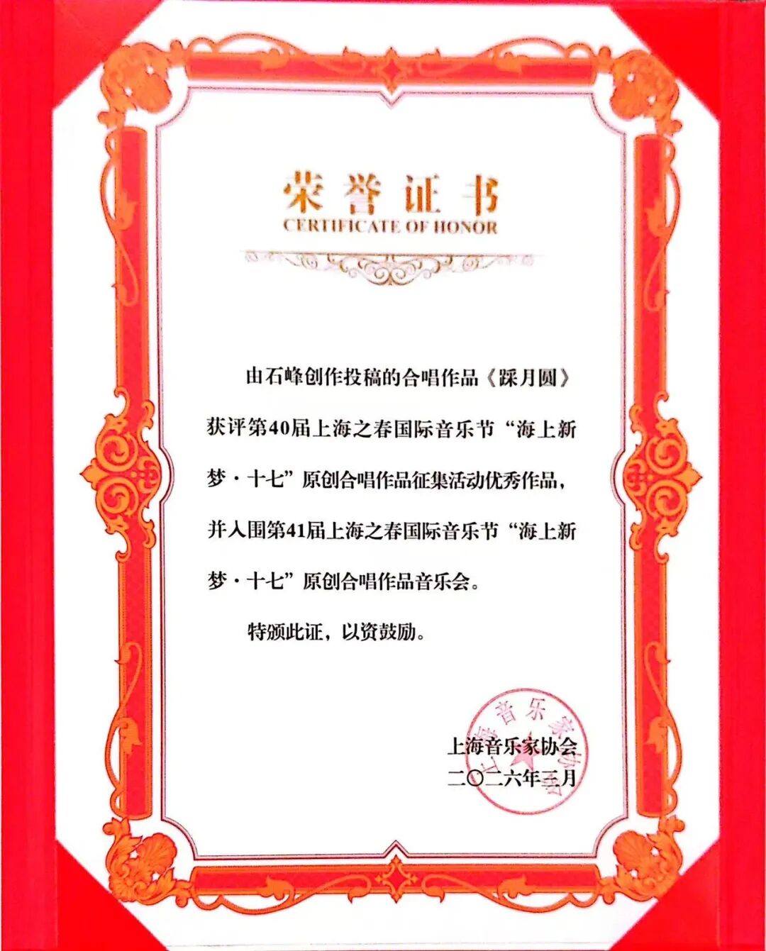 2026年4月,由上海之春国际音乐节组委会、中国音乐家协会指导,上海音乐家协会主办的第41届“上海之春”国际音乐节《海上新梦·十七》原创合唱作品音乐会在保利上海城市剧院举行。我院作曲系教师石峰创作的童声合唱《踩月圆》作为开场作品,由上海市浦东新区青少年活动中心合唱团进行世界首演。